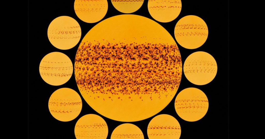 تُظهر الصورة المركبة مجموعة من البقع الشمسية التي تشكلت وزالت على سطح الشمس على مدار عام كامل. في وسط الصورة، يبرز تجميع لهذه البقع على شكل دائرة كبيرة، محاطة بصور منفصلة لكل شهر، مما يوضح توزيعها الجغرافي وتغيراتها على مدار السنة. تم التقاط جميع هذه الصور بواسطة “مرصد الديناميات الشمسية” التابع لوكالة الفضاء الأمريكية (ناسا).