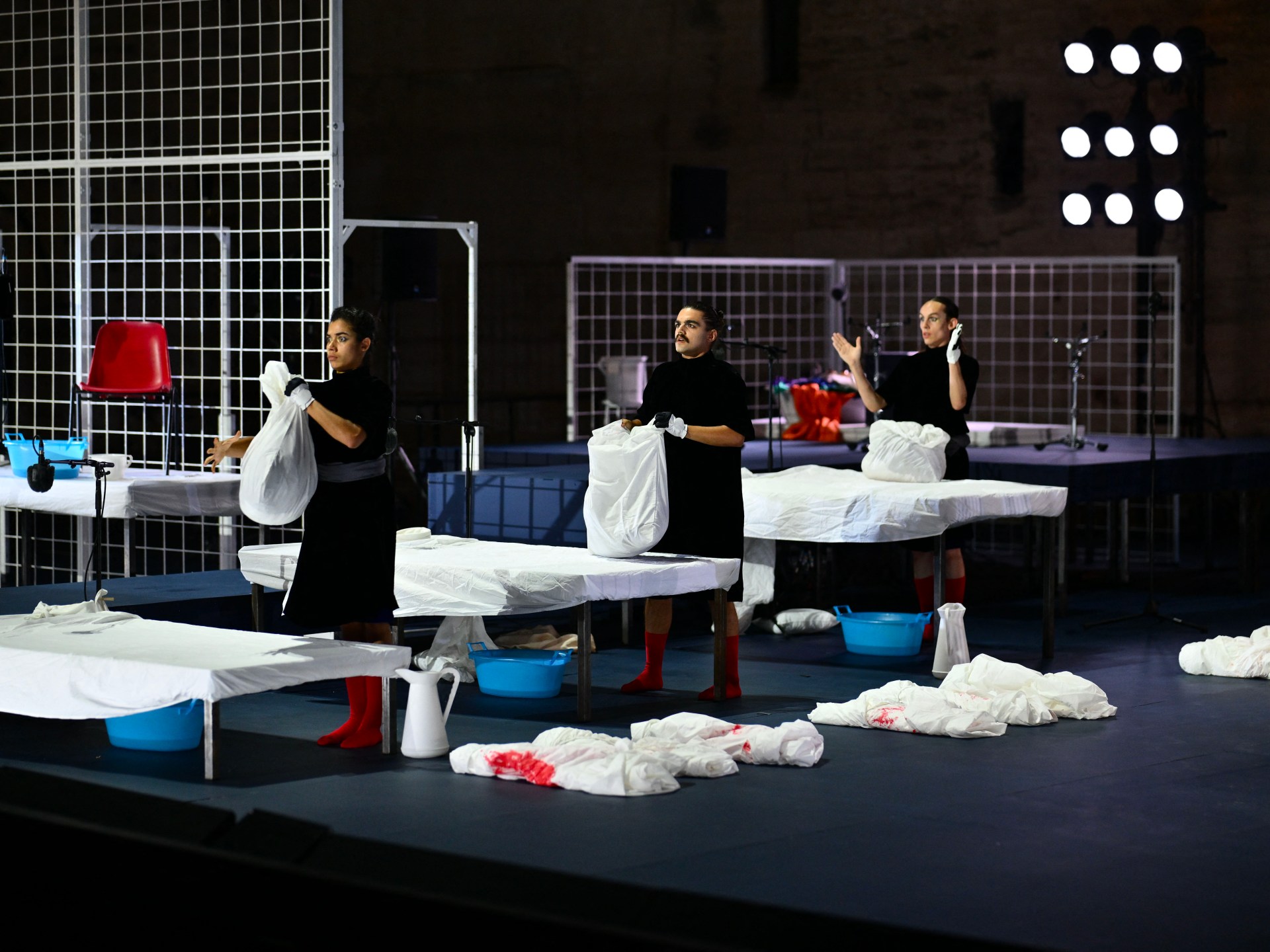 Actors perform in "Not" directed by Cape Verdean choreographer and dancer Marlene Monteiro Freitas during a rehearsal for the opening night of the Avignon Theatre festival, at the Palais des Papes in Avignon on July 3, 2025. Freitas, who will open the 79th Festival d'Avignon with a show inspired by the tales of the "Thousand and One Nights", is an outsider with a protean and colourful universe. (Photo by Christophe SIMON / AFP) / “The erroneous mention[s] appearing in the metadata of this photo by Christophe SIMON has been modified in AFP systems in the following manner: [rehearsal] instead of [premiere]. Please immediately remove the erroneous mention[s] from all your online services and delete it (them) from your servers. If you have been authorized by AFP to distribute it (them) to third parties, please ensure that the same actions are carried out by them. Failure to promptly comply with these instructions will entail liability on your part for any continued or post notification usage. Therefore we thank you very much for all your attention and prompt action. We are sorry for the inconvenience this notification may cause and remain at your disposal for any further information you may require.”