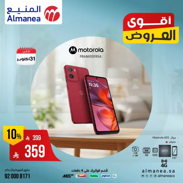 عروض المنيع تشعل المنافسة بمحموعة متنوعة من أحدث أجهزة الجوالات مستمرة حتي نهاية الشهر ويتوفر لهم خيار التقسيط على دفعات ميسرة و تشمل عروض اليوم علي أجهزة موتورولا وسامسونج و غيرها من الموديلات و يمكن الاستفادة من مزايا العروض الاخري تابعونا علي موقعكم عروض توداي ليصلكم كل جديد