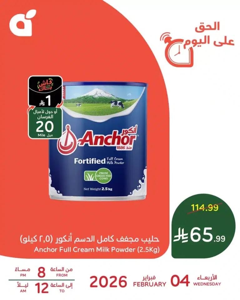 عروض بنده الاربعاء 4 فبراير 2026 الموافق 16 شعبان 1447هـ و تحتوي علي منتجات متنوعة منها حليب مجفف كامل الدسم من انكور و بتوفر ايضا هذا اليوم صدور دجاج طرية من مايدا و باسعار مميزة في عرض حصري متاح لساعات محدودة ابقوا معنا علي موقعكم عروض توداي ليصل اليكم كل جديد عن عروض السعودية