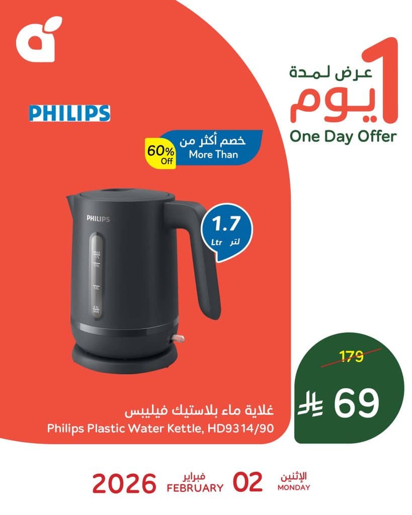 بنقدم لكم اليوم احدث عروض بنده بتاريخ الاثنين 2 فبراير 2026 الموافق 14 شعبان 1447هـ و بتحتوي علي تشكيلة من افضل الاجهزة المنزلية و خاصة المطبخ منها غلاية مياه بلاستيك من فيليبس و ايضا بتوفر خلاط يدوي و باسعار مناسبة باكثر من نصف السعر في صفقة حصرية متاحة اليوم فقط لا تفوت الفرصة ووفر الان .