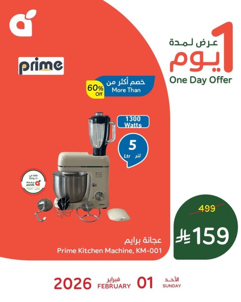 عروض بنده السعودية الاحد 1-2-2026 الموافق 13 شعبان 1447هـ و بتحتوي علي تشكيلة من افضل الاجهزة المنزلية و الخاصة بالمطبخ استعداد لشهر رمضان الكريم و بتقدم محضرة قهوة برايم و عجانة برايم و بصفقة حصرية متاحة اليوم فقط و باكثر من نصف السعر ابقوا معنا ليصلكم كل جديد عن عروض السعودية .