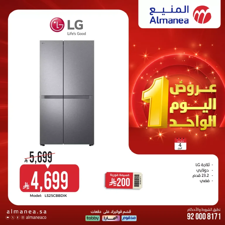 يركز عرض المنيع هذا الأسبوع بشكل أساسي على مجموعة متنوعة من ثلاجات إل جي. تشمل هذه التشكيلة ثلاجات دولابية بأحجام مختلفة، بدءًا من 15 قدمًا وصولًا إلى 27.2 قدمًا، بالإضافة إلى ثلاجات بسعة 18 قدمًا و 21 قدمًا. هذه الأنواع تلبي احتياجات مختلف الأسر وأحجام المطابخ، مما يوفر خيارات واسعة للعملاء الباحثين عن ثلاجة جديدة.
