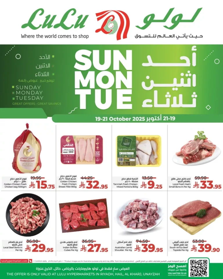 عروض لولو الرياض الأحد 19 أكتوبر 2025 تقدم مجموعة مختارة من اللحوم الطازجة والدجاج والخضار والفاكهة حيث تشمل العروض الاسبوع ده علي الدجاج الطازج والدجاج المقطع واللحم المحلي ولحم جنوب أفريقيا بالإضافة إلى الخضروات الطازجة والأسماك المبردة حيث نجد في العرض خس آيسبرج وخيار سعودي وكوسة سعودية