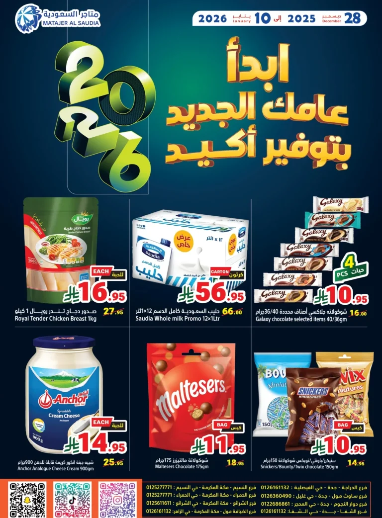 عروض متاجر السعودية الاسبوعية الاحد 4 يناير 2026 الموافق 15 رجب 1447هـ و بمناسبة العام الجديد بتقدم ليكم اشهي الاصناف من الخضروات و الفواكه كمان بتقدم افضل المنتجات الغذائية و الاستهلاكية مع اللحوم الفريش و الاسماك و الروبيان و غيرها من المنتجات و باقل الاسعار المناسبة للجميع فقط ابقوا معنا ليصلكم كل جديد