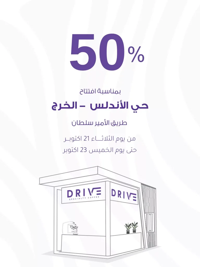 احصل على خصم 50% على جميع المنتجات ما عدا اظرف  القهوه بمناسبة افتتاح الفرع الجديد من درايف كوفي في الخرج حي الاندلس
