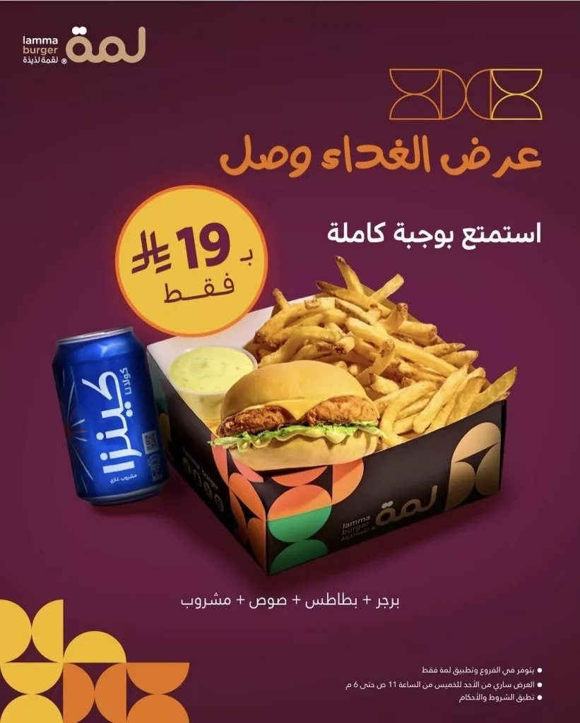 عرض مطعم لمة على الغداء تقدم لكم وجبة كاملة وشهية ب19 ريال فقط برجر بطاطا صوص ومشروب لا تفوتوا افضل العروض من لمة