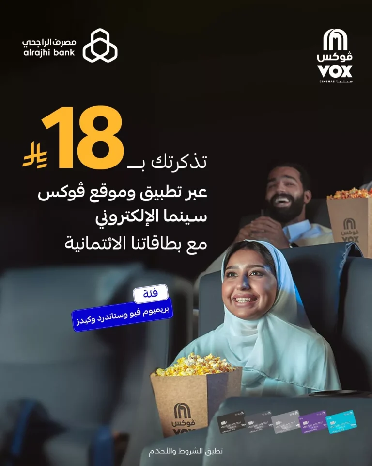 وفي هذا الإطار، يأتي عرض “بطاقة الراجحي = تذكرة بـ 18 ريال” المميز بالتعاون بين مصرف الراجحي وسينما ڤوكس، ليقدم تجربة استثنائية لحاملي بطاقات الراجحي الائتمانية بأسعار رمزية تجعل من الترفيه أمراً ميسراً للجميع