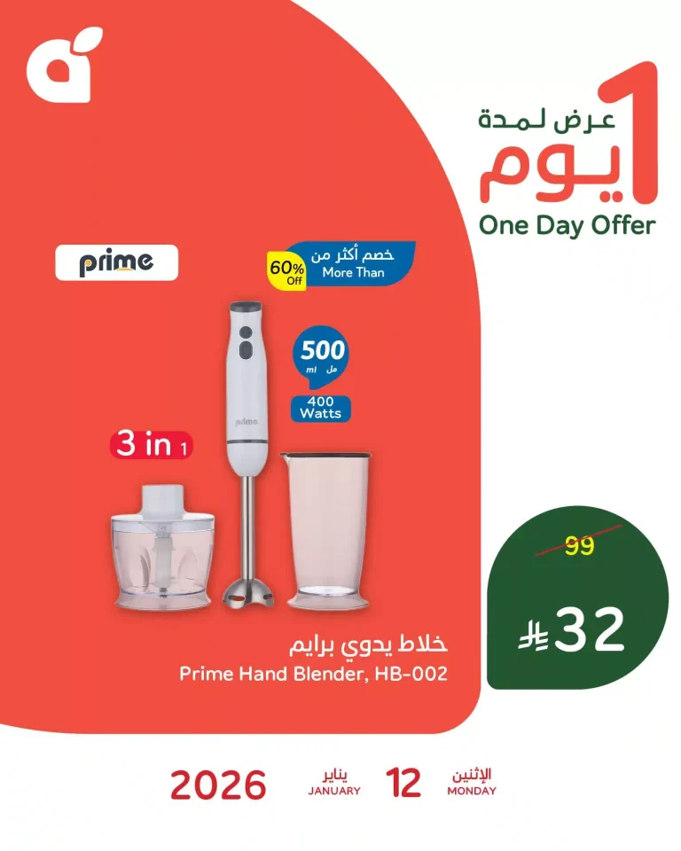 عروض بنده السعودية بتقدم ليكم اليوم الاثنين 23-7-1447هـ الموافق 12 يناير 2026 اقوي اجهزة المطبخ العملية و هي خلاط يدوي برايم – 500 واط و في عرض حصري متاح اليوم فقط باكثر من 60% ابقوا معنا علي موقعكم عروض توداي ليصلكم كل جديد عن عروض السعودية