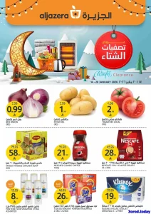 عروض أسواق الجزيرة الأسبوعية الأربعاء 14 يناير 2026 الموافق 28-7-1447هـ تقدم تشكيلة من المواد الغذائية الأساسية مثل أرز كالروز وزيت الزيتون المنكه وشرائح الجبنة السويسرية ومربى التوت البري وطحينة الحلاوة وتتبعها عروض الأجهزة المنزلية و تضم محضرة السلطة الكهربائية ومكينة صنع الثلج الكبيرة ومروحة بدون شفرات وفرن تحميص ومكواة بخار .