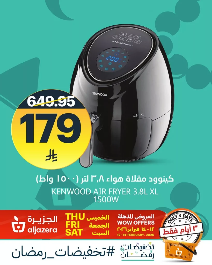 عروض أسواق الجزيرة على ادوات المطبخ من 12 حتي 14 فبراير 2026 أو حتي نفاد الكمية تخفيضات رمضان جددي مطبخك وخلي الطبخ أسهل في رمضان منتجات متنوعة و اسعار منافسة في جميع الفروع في المملكة على الخلاطات و القلايات الهوائية و العديد من اجهزة المطبخ المميزه بأفضل الاسعار