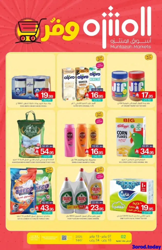 عروض أسواق المنتزه الأربعاء 7 يناير 2026 الموافق 18-7-1447هـ و تشمل الجرجير واللفت الأبيض والفجل والطماطم والعنب والأناناس والحليب والجبن والطحينة البيضاء والسميد ودقيق الحلويات ثم تمتد إلى الأجهزة الكهربائية مثل صانعة زبادي ومفرمة لحوم وصانعة شوربة وفرن طاولة صغير باسعار تنافسية مناسبة للجميع