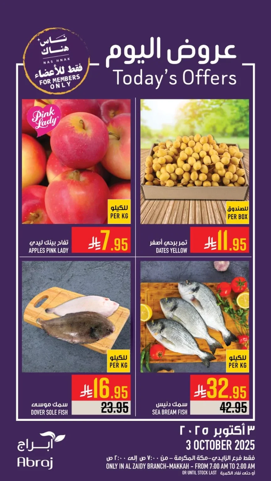 عروض أبراج هايبر ماركت الجمعة 3-10-2025 تتألق بمجموعة متميزة من المنتجات الطازجة والغذائية حيث تشمل الفواكه مثل التفاح الوردي الشهي والتمور الصفراء اللذيذة مع تنوع الأسماك الطازجة مثل سمك موسى وسمك الدنيس بالإضافة إلى أصناف أخرى كالجبن المصري قليل الملح واللوز المحمص بالليمون وأشهى الأطباق الجاهزة