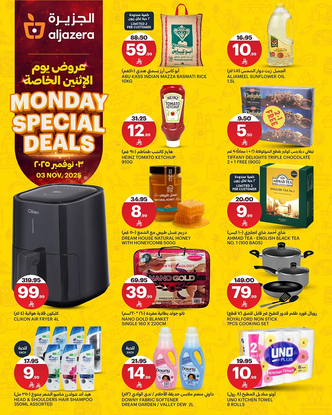 عروض أسواق الجزيرة الاثنين 3-11-2025 و تقدم مجموعة من المنتجات الطازجة والمستوردة تشمل الفواكه والخضروات والدواجن المجمدة بالإضافة إلى العصائر والمعلبات والزيوت والبقوليات و توفر أيضا تشكيلة واسعة من المنتجات المنزلية والغذائية مثل الأرز الهندي الفاخر والزيوت النباتية والشاي وغيرها باسعار تنافسية