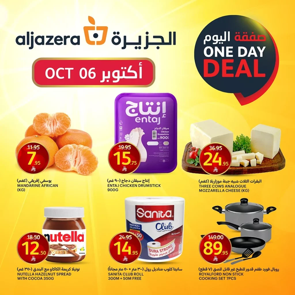 عروض أسواق الجزيرة اليوم الاثنين 6 أكتوبر 2025 تقدم تشكيلة حيث تتوفر فواكه المندرين الإفريقي الطازج بنكهاتها الطبيعية الغنية ودجاج انتاج و تشمل أيضا مجموعة مختارة من المنتجات المنزلية الهامة مثل معجون الشوكولاتة بالبندق نوتيلا باقل الاسعار التي تناسب الجميع .