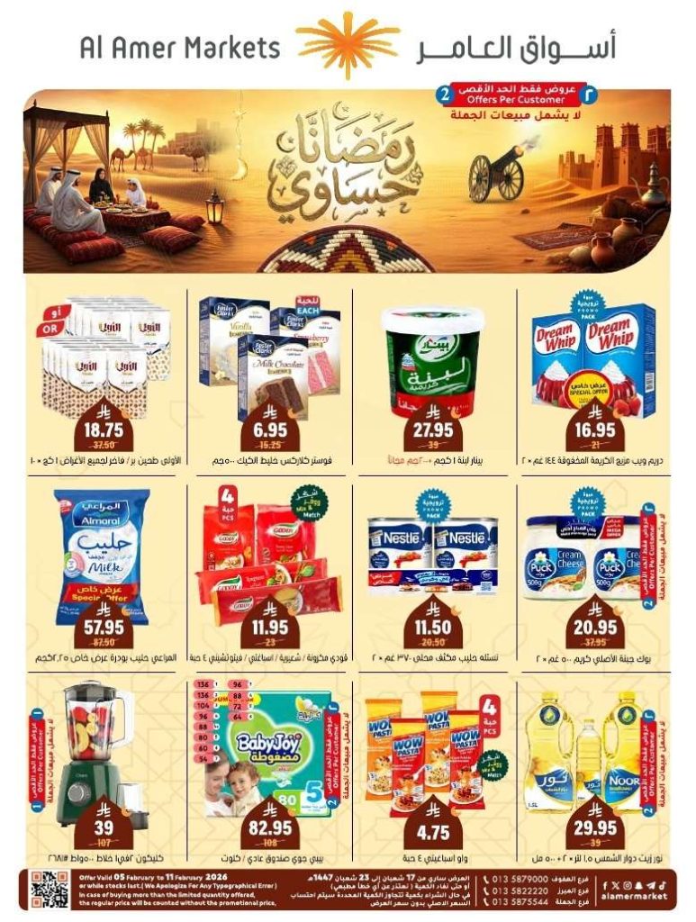 عروض اسواق العامر الاسبوعية السبت 19-8-1447هـ الموافق 7 فبراير 2026 و تحتوي علي المواد الغذائية الأساسية مثل طحين الأولى للأغراض الفنية وخليط كيك فوستر كلاركس ولبنة بينار الكريمة ومزيج الكريمة المخفوقة