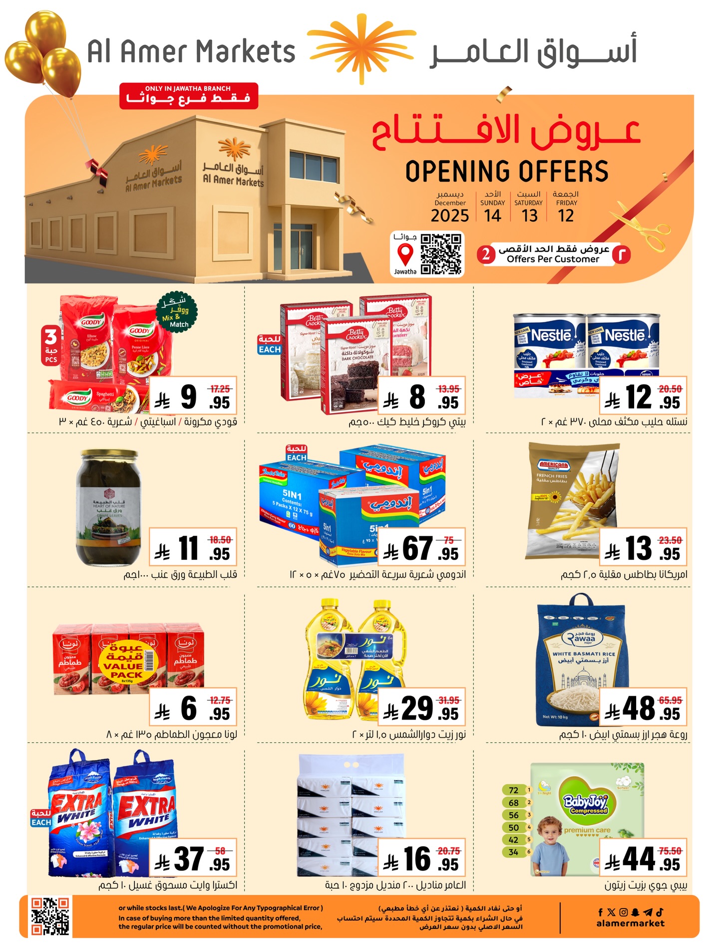 نواصل معكم احدث عروض اسواق العامر السعودية الجمعة 12-12-2025 و تحتوي علي حبوب الإفطار المتنوعة وحليب البودرة ومسحوق الشوكولاتة والقهوة وتشمل ايضا المشروبات الساخنة والباردة منتجات الألبان والجبن والعسل والزيوت والشاي والأرز والمناديل الورقية وغيرها من المنتجات انتظرونا في تغطية مباشرة و حصرية لـ احدث عروض رمضان 1447هـ علي موقعكم عروض توداي .