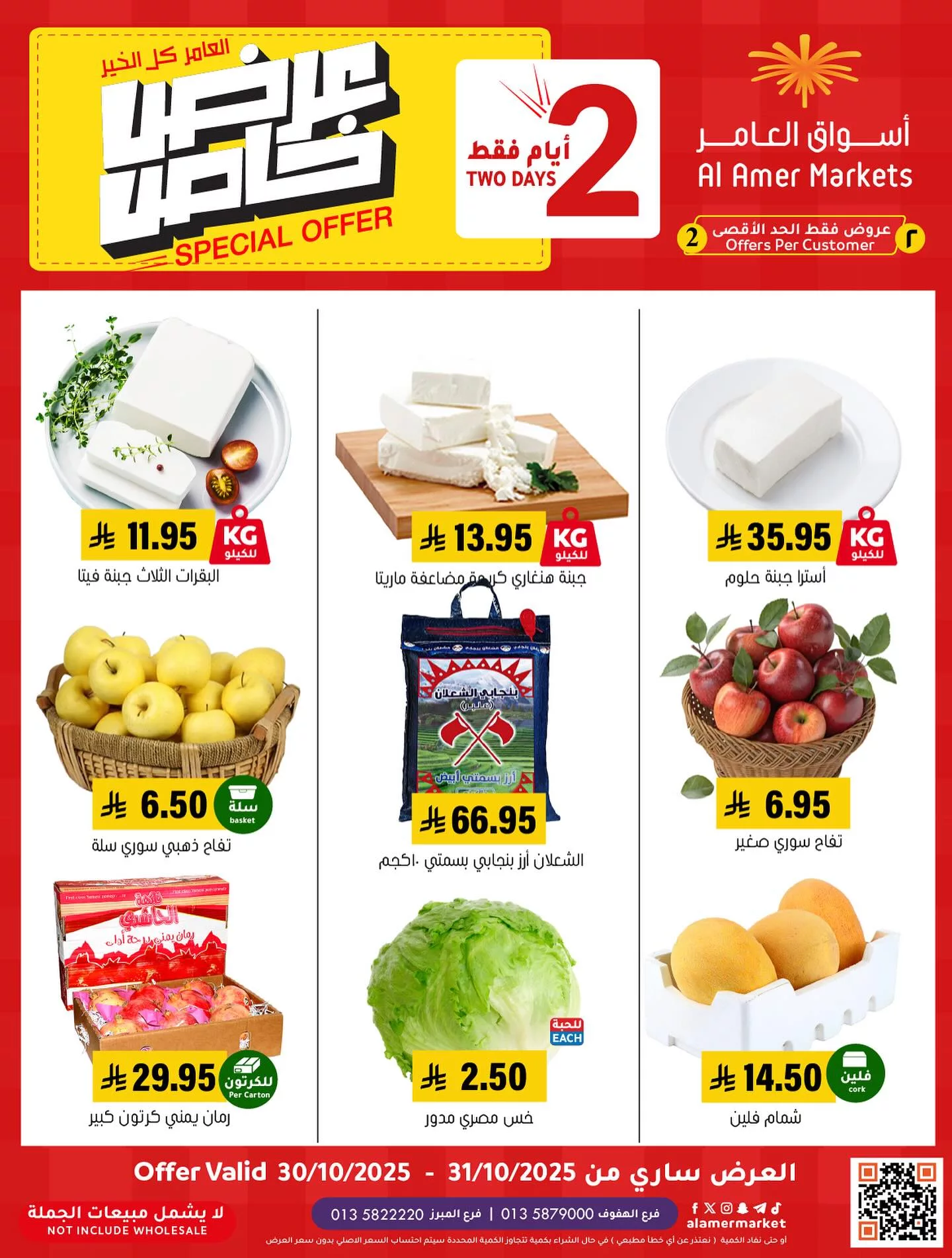 عروض أسواق العامر الخميس 8 جماد الاول 1447هـ تقدم تشكيلة مميزة من الجبن الطازج بأنواعه إضافة إلى التفاح السوري والصاصي والخس الطازج والشمام بتشمل أيضا منتجات اخري مثل جبنة حلوم وألذ الأجبان البيضاء والخضروات الطازجة المتنوعة كما ان العرض حصري متاح لمدة يومان فقط انتهز الفرصة و بادر بالشراء الان