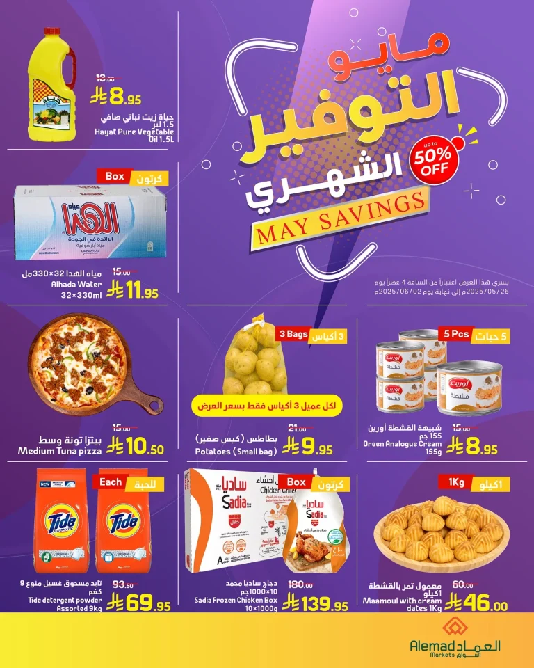 تقدم عروض أسواق العماد الاثنين 26 مايو 2025 باقة مميزة من العروض التي تشمل منتجات غذائية متنوعة من الزيوت والمجمدات والمعلبات، حيث تتوفر أصناف معروفة مثل زيت حياة ودجاج ساديا وبيتزا التونة إلى جانب معجون الطماطم وحليب المبخر ضمن باقات متعددة تناسب احتياجات العائلة اليومية