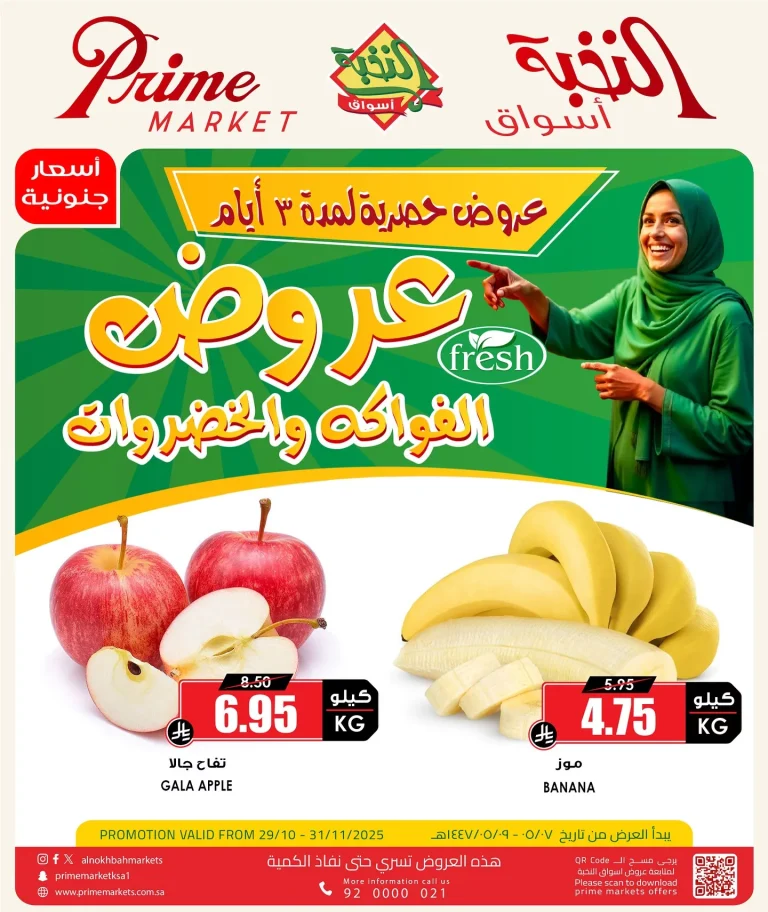 عروض أسواق النخبة الأربعاء 29 أكتوبر 2025 تقدم تشكيلة من الفواكه الطازجة والخضروات المتنوعة منها التفاح الأحمر والموز والرمّان المصري في السلات إلى جانب تشكيلة واسعة من الخضار مثل البصل الأبيض والقرع الأمريكي والبصل الأحمر المتوسط بالإضافة إلى البروكلي الطازج وصناديق الخيار والباذنجان باسعار تنافسية