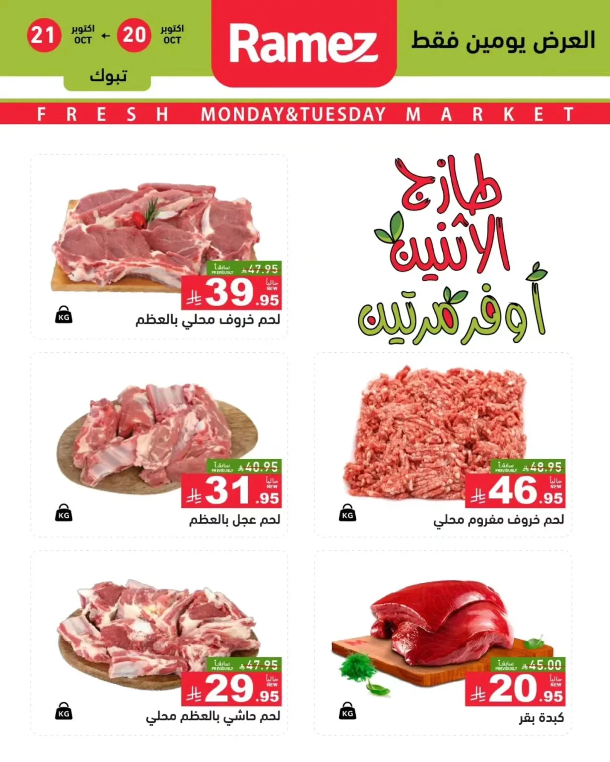 عروض اسواق رامز السعودية الاثنين 20 اكتوبر 2025 تشمل تشكيلة واسعة من اللحوم الطازجة من لحوم الخروف السواكني ولحم العجل الصافي إلى السجق البلدي بالإضافة إلى قطع اللحم بالعلظم و بتوفر كمان لحم الخروف النعيمي واللحم المفروم واللحوم المحلية إلى جانب الكبده الطازجة من العجل والبقر