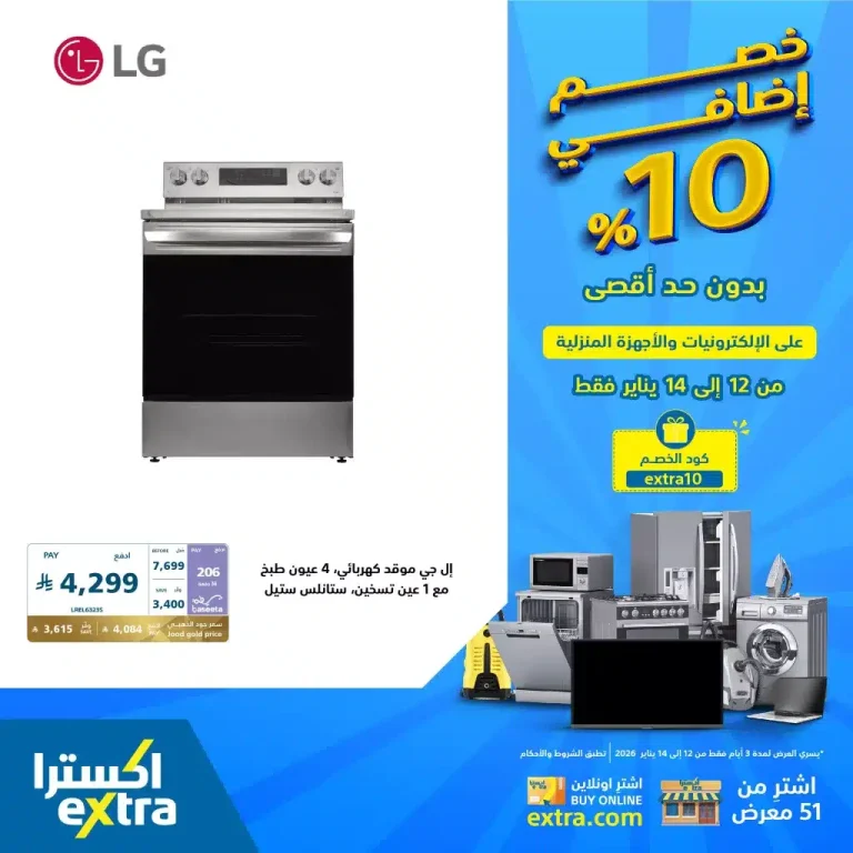 عروض اكسترا السعودية الاثنين 23-7-1447هـ الموافق 12 يناير 2026 و تحتوي افضل العروض علي الاجهزة الكهربائية الكبيرة منها الثلاجات و الغسالات و مواقد الغاز في عرض حصري باقل الاسعار متاح لمدة 3 ايام مع خصم اضافي 10% كحد اقصي تابعونا علي موقعكم عروض توداي ليصلكم كل جديد