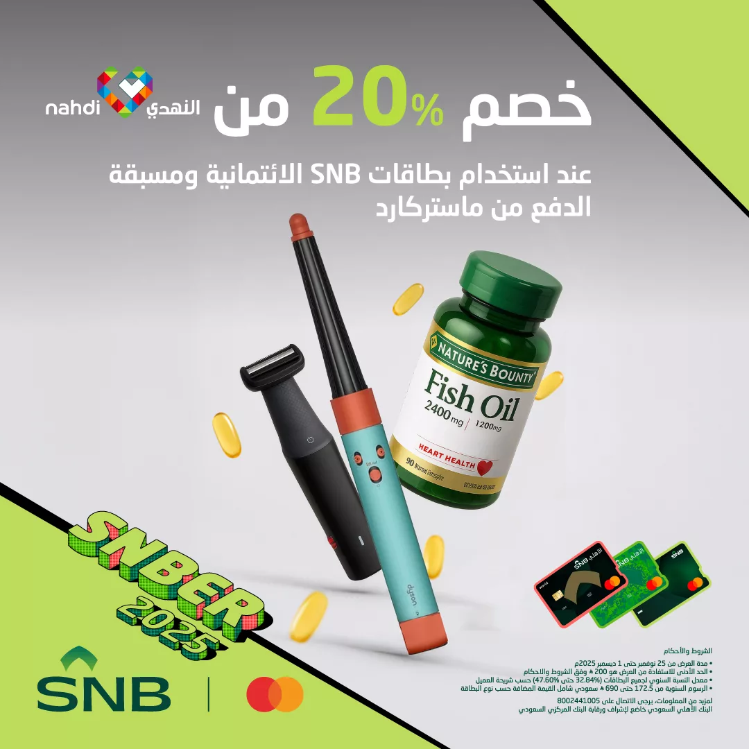 • صحة أفضل وتوفير أكثر مع النهدي و البنك الاهلي استمتع بخصم %20 من النهدي عند استخدام بطاقات “SNB” الائتمانية ومسبقة الدفع من ماستركارد