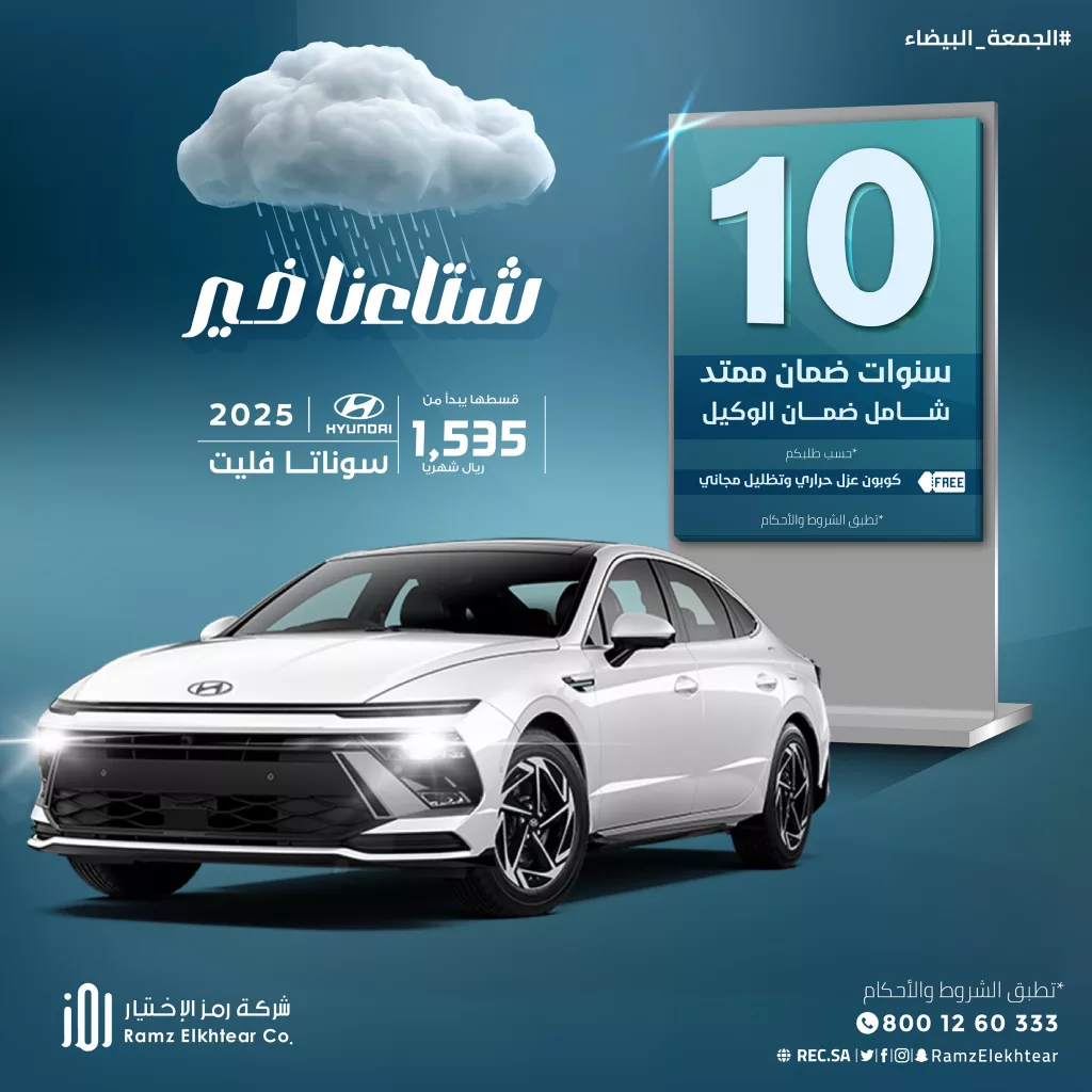 عروض شتاءنا خير من شركة رمز الإختيار بمناسبة الجمعة البيضاء 2024 تقدم فرصة فريدة لاقتناء سيارات بأقساط شهرية ميسرة تبدأ من أسعار مغرية لتناسب مختلف الفئات بالإضافة إلى ميزة الضمان الممتد الذي يصل إلى 10 سنوات مما يوفر راحة بال لعملائها من خلال تأمين شامل على المدى الطويل و العرض يشمل سيارات كيا وهيونداي المتنوعة