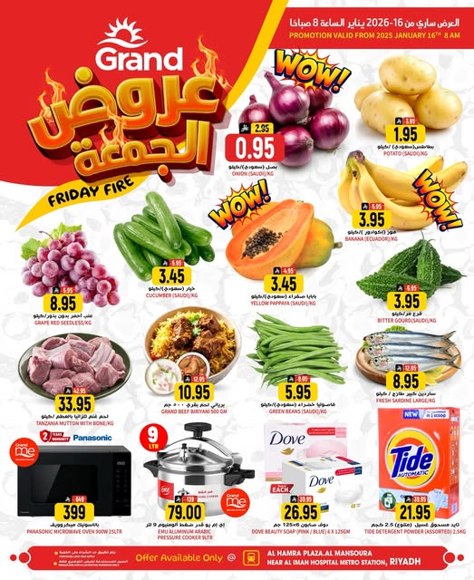 عروض الجمعة الطازجة في جراند هايبر الرياض 16-1-2026 فقط على افضل المنتجات المختارة و بأسعار مميزه استفيدوا من التخفيضات المتوفره في جراند هايبر ماركت – الحمراء بلازا، المنصورة (مخرج 21) الرياض ضمن عروض مميزة مذهلة على المنتجات الطازجة
