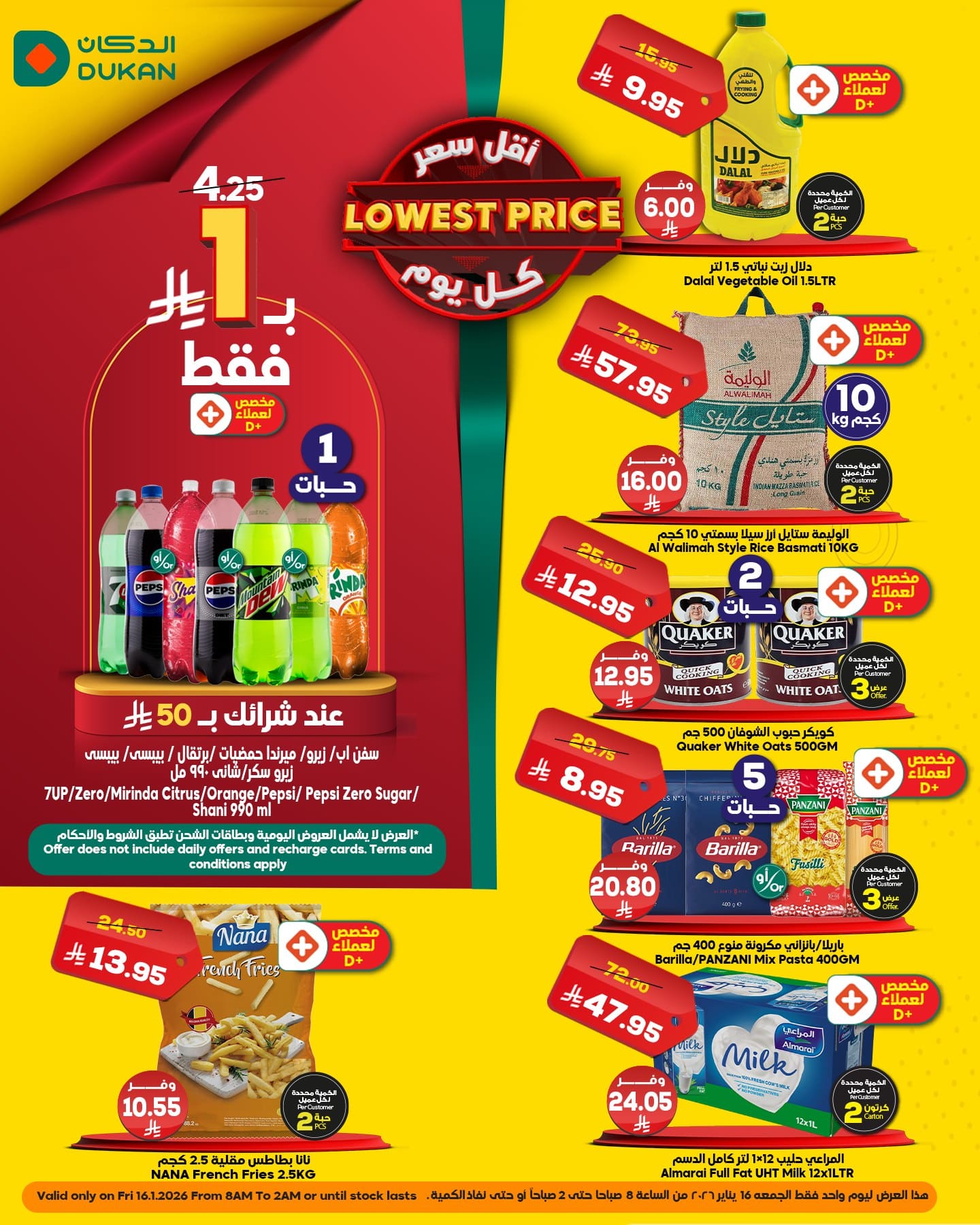 عروض الدكان الخاصة 16 يناير 2026 خربناها على الآخــــر على منتجات مختارة بأفضل الاسعار التي سوف تشاهدونها ضمن عروض نهاية الاسبوع في جميع فروع الدكان على المواد الغذائية العرض ليوم واحد فقط الجمعه 16 يناير 2026 من الساعة 6 صباحاً أو لحين تنفد الكمية