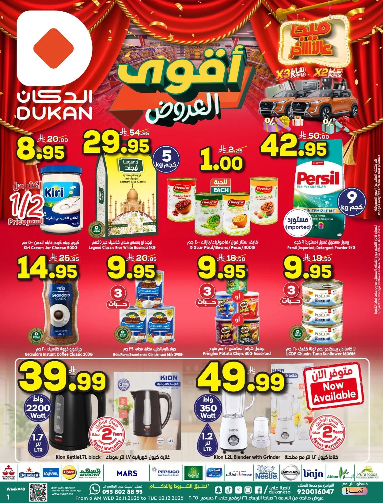 عروض الدكان جدة الأسبوعية الأربعاء 5 جماد الاخر 1447هـ تضم أجهزة منزلية تشمل أجهزة خبز كهربائية صغيرة ومحضرات طعام وشوايات ضغط وخلاطات ستانلس ومقالي كهربائية ثم تمتد السلع الغذائية إلى البصل والبطاطس الصغيرة والجريب فروت الأحمر والتوت الأزرق والجبنة البيضاء و لحم البقر المشوي والفطائر
