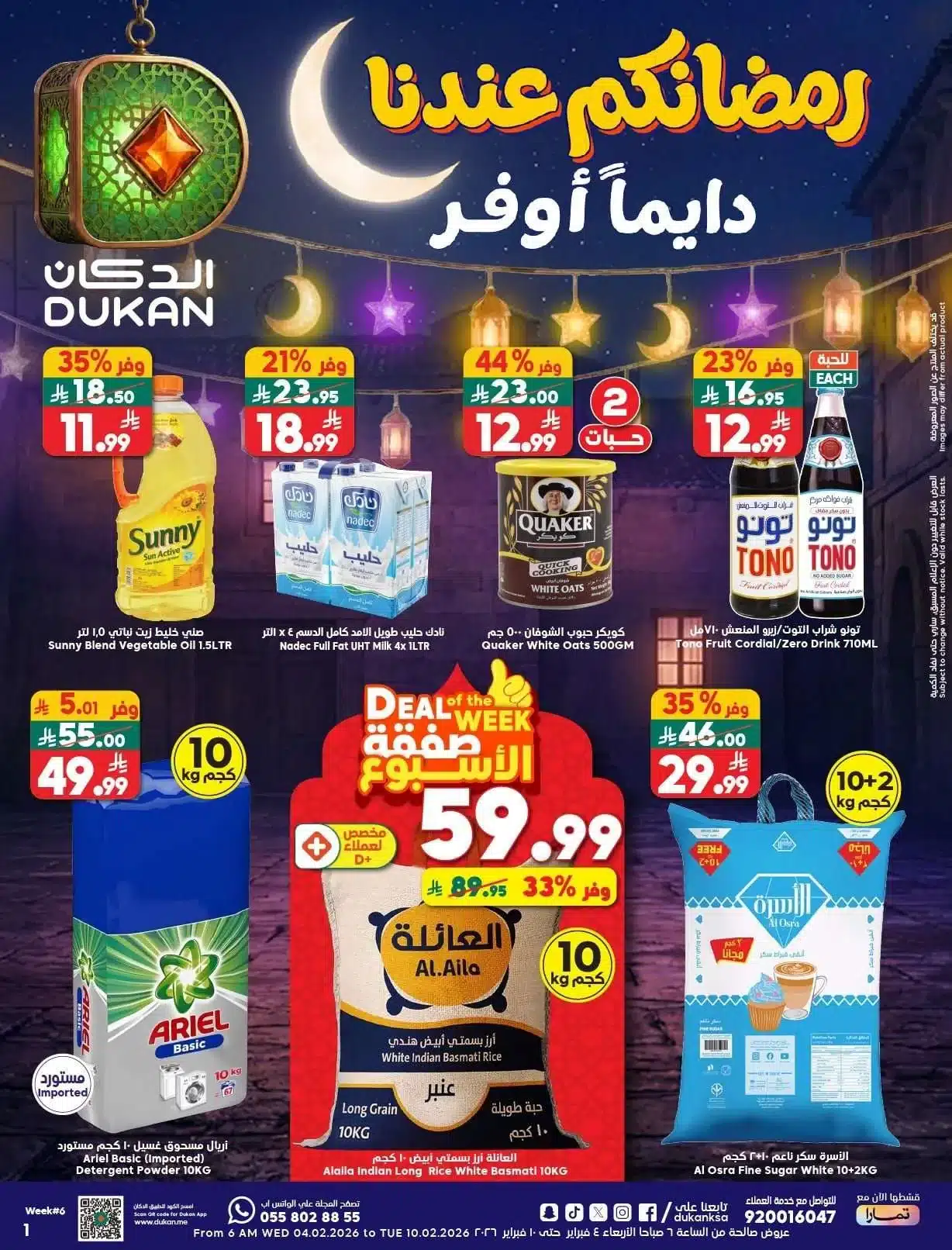 عروض الدكان جدة الأسبوعية الأربعاء 16 شعبان 1447هـ الموافق 4-2-2026 و تحتوي الأجهزة على خلاط فواكه وموزع صابون ومبرد مياه وجهاز تسخين الخبز ومفرمة بصل وسخان مياه كهربائي وقلاية هوائية فرن كهربائي ومحضر طعام ثم ننتقل للمنتجات الغذائية و توفر الربيان صدور الدجاج زيت النباتي الذرة المعلبات المكسرات الجبنة الزيتون الأرز السكر العدس الشاي