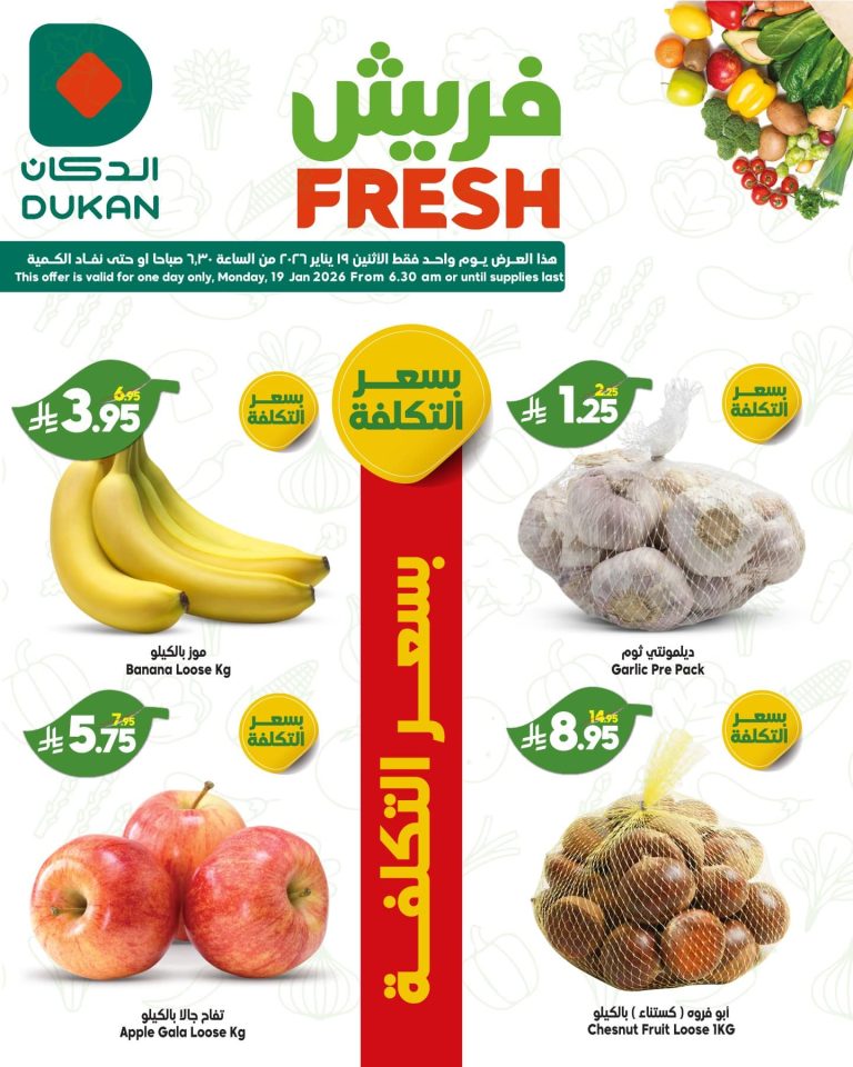 بنقدم ليكم احدث عروض الدكان جدة الاثنين 19 يناير 2026 الموافق 30 رجب 1447هـ و تحتوي علي تشكيلة من اشهي المنتجات الغذائية و الخضروات مثل البطاطس و الطماطم و الفلفل و ايضا الفواكه و الاجبان المخللات المشكلة و غيرها من المنتجات باقل الاسعار المناسبة للجميع تابعونا علي موقعكم عروض توداي ليصلكم كل جديد