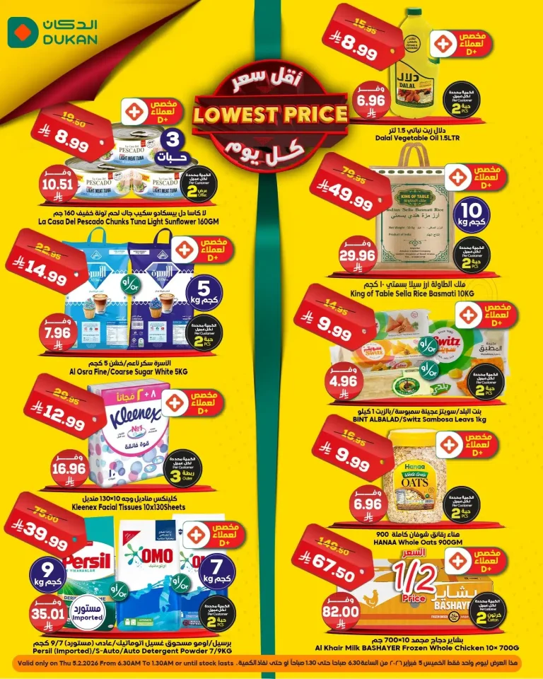 نقدم لكم احدث عروض الدكان جدة الخميس 5 فبراير 2026 الموافق 17-8-1447هـ و تحتوي علي ويال صدر دجاج طري وصني خليط زيت نباتي ودلال زيت نباتي ولا كاسا دل بيسكادو سكيب جاك لحم تونة خفيف وملك الطاولة أرز سيلا بسمتي والأسرة سكر ناعم أو خشن وبنت البلد أو سويتز عجينة سمبوسة و تشكيلة من المنتجات الاخري و باقل الاسعار