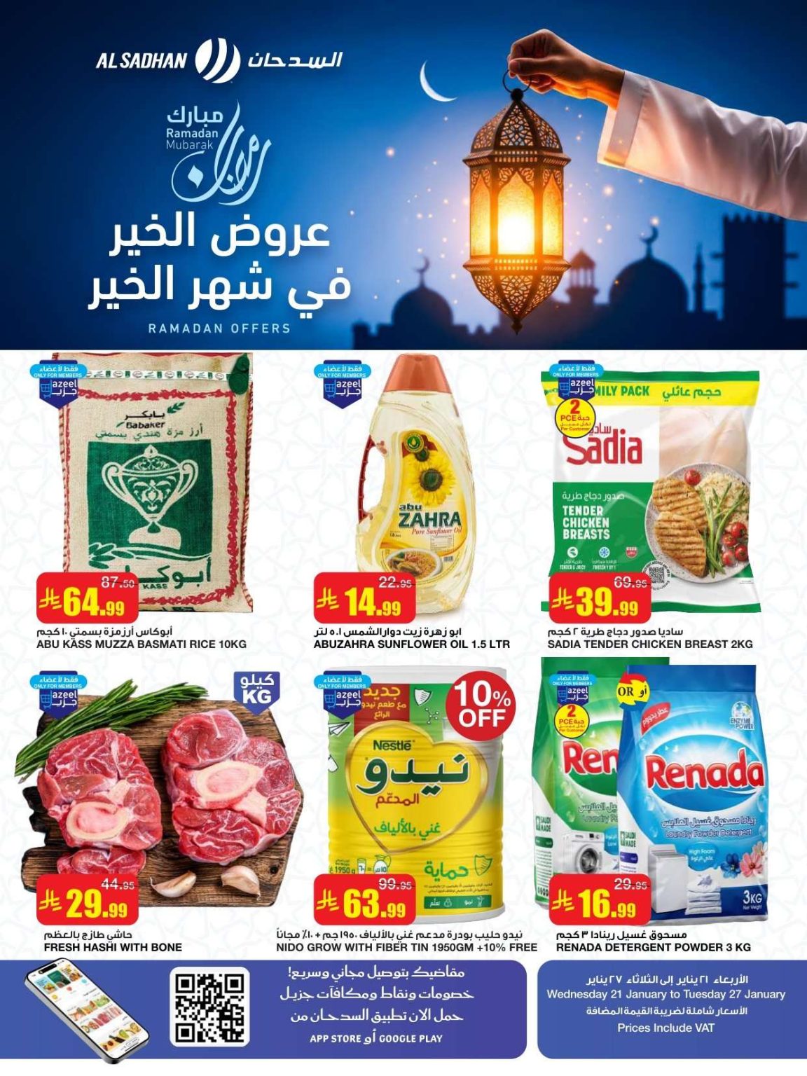 عروض السدحان الأسبوعية الأربعاء 2 شعبان 1447هـ الموافق 21 يناير 2026 و تبدأ بالأجهزة و يحتوي على جهاز طهي البيض ومكينة تزيين الكيك وميزان قياس نسبة الدهون ومبرد مياه متنقل ومروحة سحب للمطبخ وسخان طعام و بتوفر تشكيلة من المنتجات الغذائية منها أجنحة الدجاج وأرز سيلا البسمتي والسمن البقري وجبنة الشيدر وزيت السمسم والقهوة والهيل المطحون