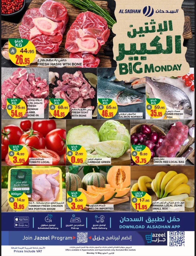 عروض السدحان الطازج الاثنين 12 مايو 2025 تقدم مجموعة مميزة من اللحوم الطازجة والأسماك عالية الجودة لتناسب مختلف الأذواق والاحتياجات حيث تشمل اللحوم الحاشي بالعظم والتيوس الطازجة والسلمون النرويجي والسمك الطازج بأنواعه مما يجعلها فرصة رائعة لعشاق الطهي المنزلي والباحثين