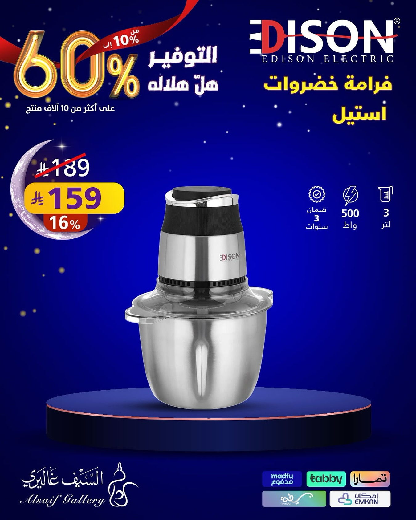 بنقدم ليكم اليوم احدث عروض السيف غاليري بمناسبة شهر رمضان الكريم 2026 و تحتوي علي تشكيلة من الاجهزة المنزلية و خاصة اجهزة المطبخ من القلايات و اجهزة الفرم المنزلية و و قدور ضغط هوائية متنوعة بالاضافة الي المكانس الكهربائية من ماركات معروفة و غيرها من المنتجات مع خصومات 60% التوفير هل هلاله