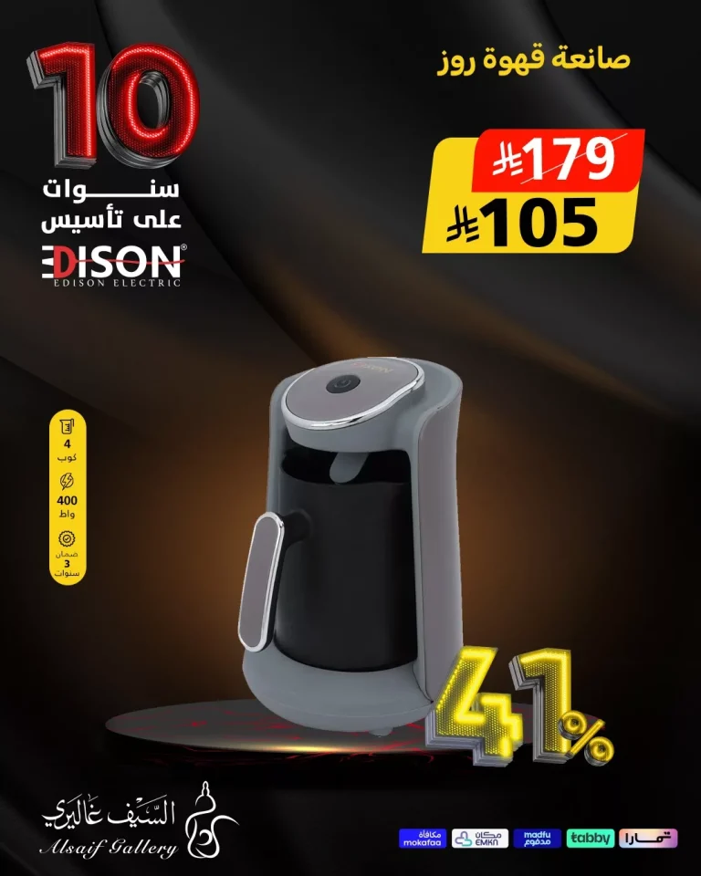 عروض السيف غاليري بتقدم بمناسبة مرور 10 سنين على تأسيس إديسون تخفيضات كبيرة على جميع الثلاجات والأفران بدون استثناء و تشمل كمان تشكيلات متنوعة من الأجهزة الكهربائية الصغيرة مثل صانعة القهوة روز والخلاط اليدوي ستيل وقدر الضغط الكهربائي بوعاء جرانيت باسعار اكتر من رائعة