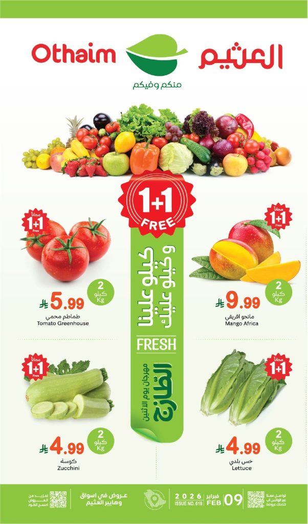 عروض العثيم الطازج الاثنين 9-2-2026 و تحتوي علي تشكيلة متنوعة من المنتجات الطازجة منها الخضروات مثل الطماطم والكوسة والملفوف والفواكه كالمانجو والتفاح والرمان مع توفير 1+1 مجانا