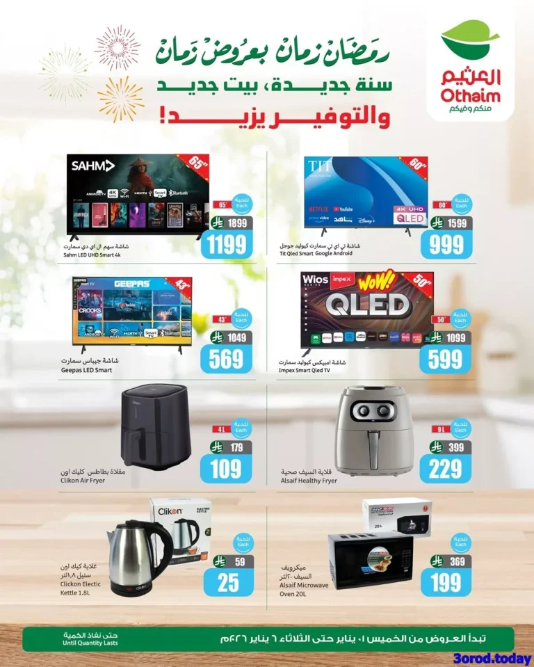 بنذكر حضراتكم بان عروض العثيم مستمرة ليوم الثلاثاء 6 يناير 2026 – 17 رجب 1447هـ و بتحتوي علي تشكيلة من افضل الاجهزة الكهربائية و مستلزمات المطبخ من القلايات و الخلاطات و شاشات التلفزيون و مواقد الغاز و غيرها من الاجهزة باسعار مميزة في رمضان زمان بعروض زمان رجعت و باقوي التخفيضات ابقوا معنا ليصلكم كل جديد