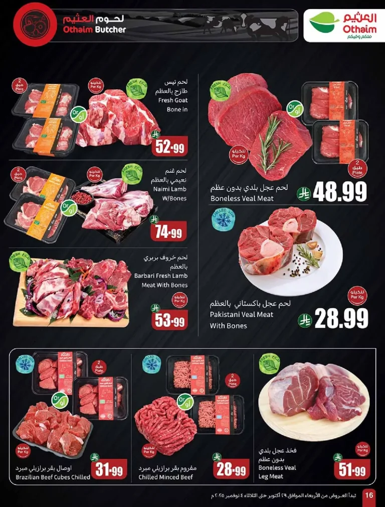 عروض العثيم حتي الثلاثاء 13 جماد الاول 1447هـ و تتنوع بتقديم تشكيلة واسعة من منتجات الدجاج الطازج مثل دجاج اليوم الطازج وشرائح صدر الدجاج الطازج من علامات تجارية مشهورة إضافة إلى اللحوم الطازجة حيث تشمل اللحوم الحمراء بأنواعها مثل لحم الغنم النعيمي ولحم الخروف البربري ولحم العجل الباكستاني وغيرها باقل الاسعار