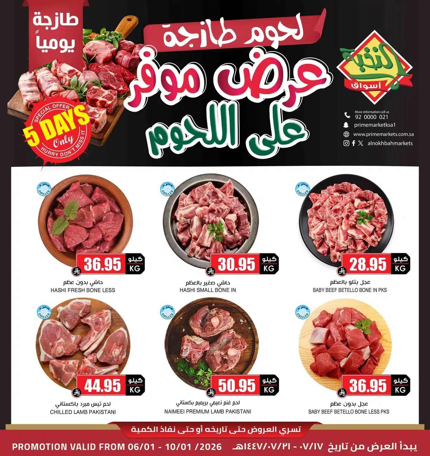عروض اسواق النخبة اليوم الثلاثاء 6 يناير 2026 الموافق 17 رجب 1447هـ و تحتوي اليوم علي تشكيلة من افضل اصناف اللحوم الطازجة في عرض حصري ابتداء من اليوم و متاح في اكثر من 130 فرع حول المملكة و باسعار تنافسية مناسبة للجميع ابقوا معنا علي موقعكم عروض توداي ليصل اليكم كل جديد
