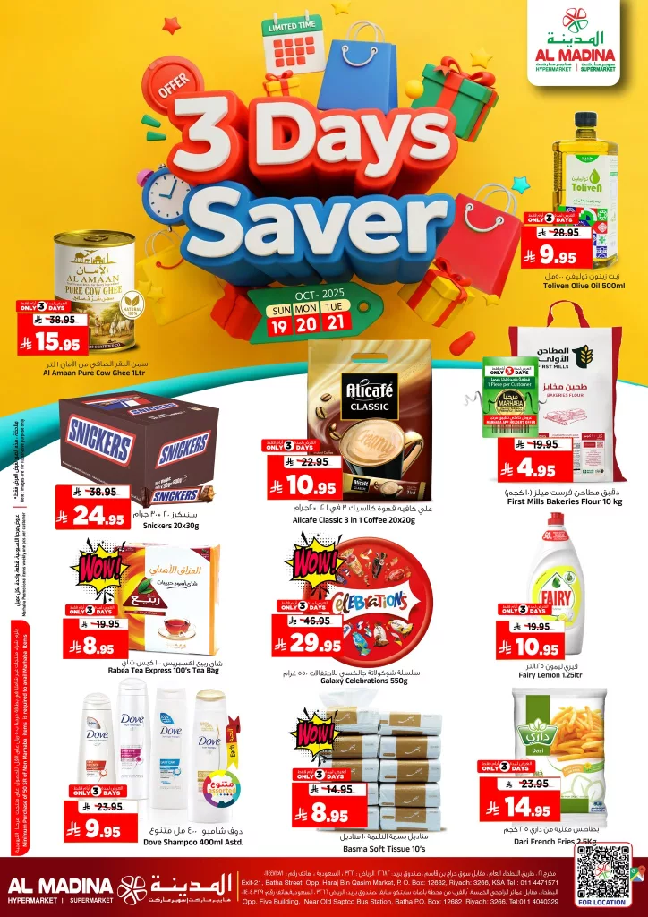 عروض المدينة هايبر ماركت الأحد 27 ربيع الثاني 1447هـ تقدم تشكيلة من المنتجات الغذائية والمنزلية منها أرز بسمتي فاخر وحليب مجفف ومواد تنظيف مثل مسحوق الغسيل والشاي الفاخر إضافة إلى منتجات القهوة والشوكولاتة والعصائر الطازجة باسعار رائعة و لمدة 3 ايام فقط ابقوا معنا ليصلكم كل جديد