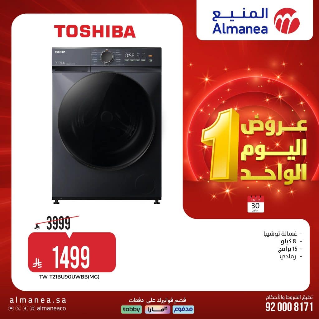 عروض المنيع اليومية الجمعة 30-1-2026 الموافق 11 شعبان 1447هـ و تحتوي علي قلاية هوائية نينجا و غسالة باناسونيك و مكبر صوت جي بي إل و سماعة رأس جي بي إل لايف و محضر طعام براون و جهاز بلايستيشن ٥ و غسالة توشيبا و عجانة أكسبر و طابعة كانون بيكسما و غيرها من الاجهزة باقل الاسعار متاحة اليوم فقط .
