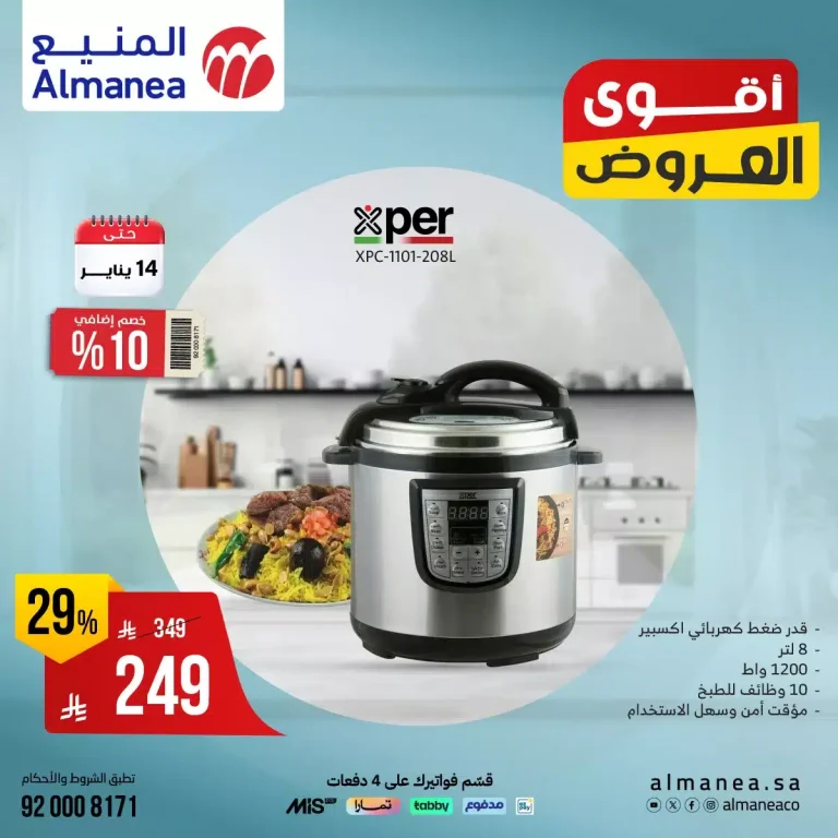 عروض المنيع مستمرة حتي الاربعاء 14 يناير 2026 – 25 رجب 1447هـ و تحتوي علي تشكيلة من افضل الاجهزة المنزلية و الكهربائية منها القلايات و الميكروويف و الثلاجات و ميزان المطبخ الرقمي و غيرها من الاجهزة باسعار تنافسية مناسبة للجميع فقط ابقوا معنا ليصلكم كل جديد علي موقع عروض توداي .