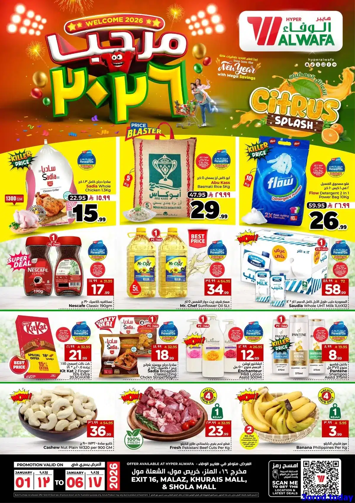 عروض الوفاء هايبر ماركت الأربعاء 11 رجب 1447هـ الموافق 31-12-2025 تركز على المنتجات الغذائية و تضم الأرز والمعكرونة والحمص المطحون وزيت دوار الشمس وصلصة الطماطم المتنوعة ثم تضيف أجهزة كهربائية مثل مروحة حائط وسخان شاي كهربائي وخلاط عصائر وفرن تحميص وجهاز خفق و متنوع من ادوات تحضير الطعام