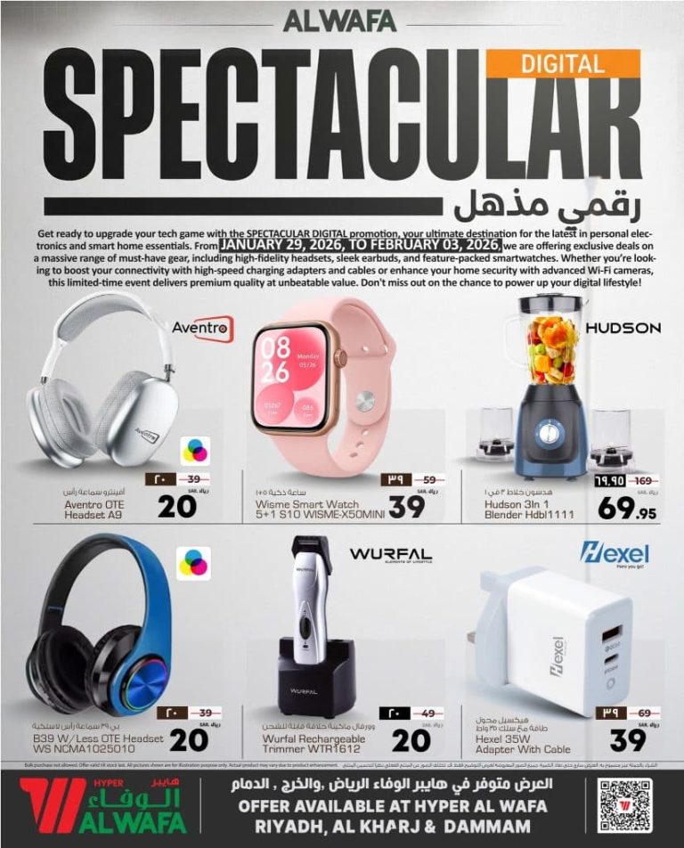 نقدم لكم اليوم عروض الوفاء هايبر ماركت الخميس 10-8-1447هـ الموافق 29 يناير 2026 و تشمل أجهزة المطبخ مثل الخلاطات ومطاحن القهوة وأدوات طهي الأرز وصانعات الساندوتشات والغسالات والمكاوي الكهربائية بالإضافة إلى تشكيلة واسعة من مستلزمات التقنية مثل سماعات الأذن اللاسلكية وسماعات الرأس الكبيرة والساعات الذكية