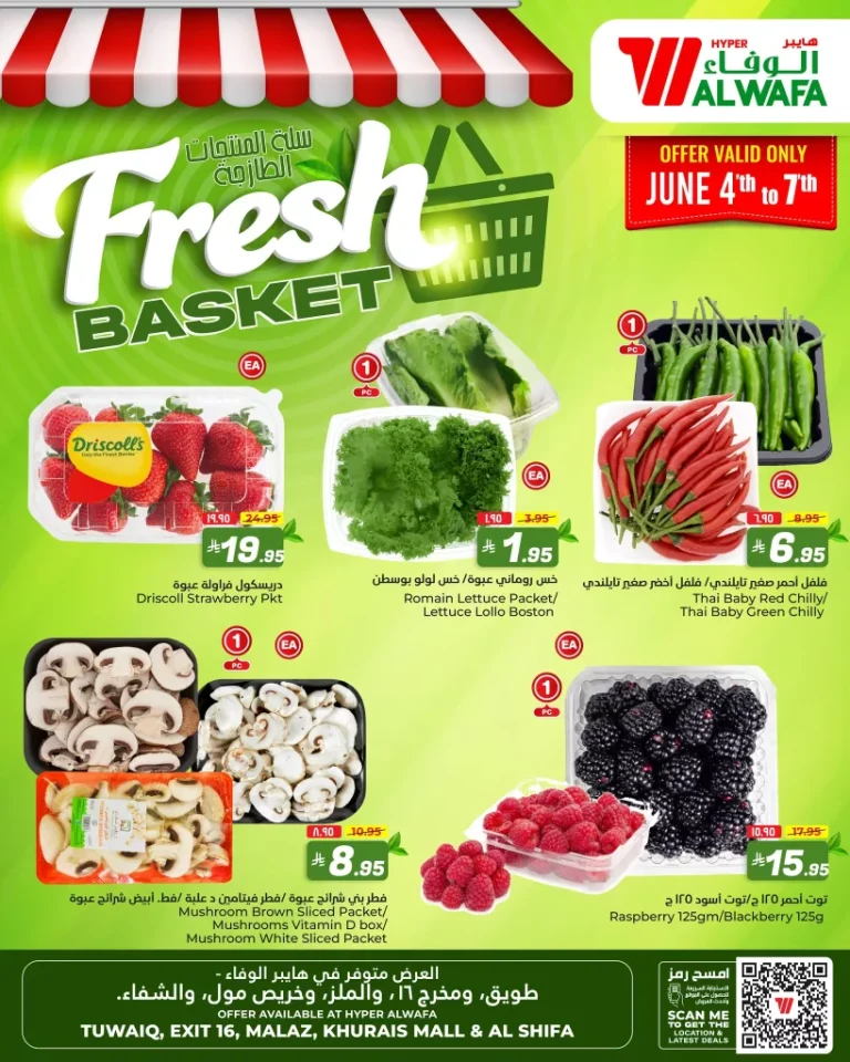 عروض الوفاء هايبر ماركت الخميس 5 يونيو 2025 تقدم مجموعة طازجة من الفواكه الموسمية الفاخرة بتشكيلة متنوعة ترضي جميع الأذواق تشمل التوت الأزرق والفراولة وتوت العليق والرومبوتان إضافة إلى الجاك فروت المميز والفطر الأبيض عالي الجودة مما يجعل تجربة التسوق مليئة بالنكهات الطبيعية المختارة