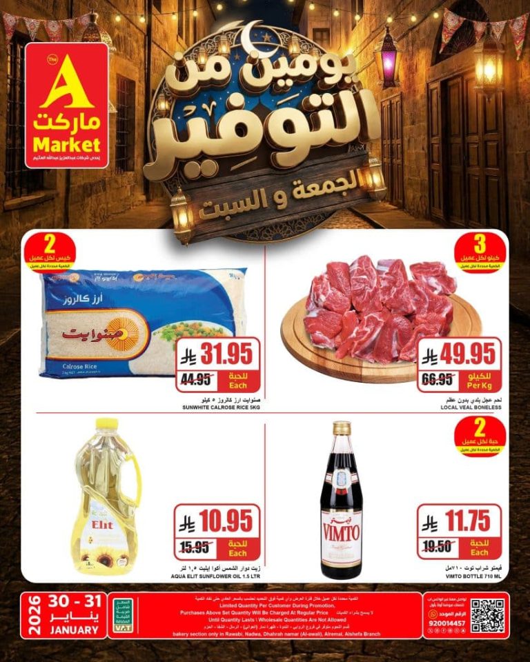 نقدم لكم احدث عروض ايه ماركت الرياض الجمعة 30 يناير 2026 الموافق 11 شعبان 1447هـ و تشمل علي أرز كالروز صنوايت ودقيق فوم وحليب فاليتا المجفف وشوفان كويكر وزيت دوار الشمس ومعجون طماطم السعودية وشراب فيمتو التوت وبالإضافة إلى قسم الطازج الذي يوفر لحم العجل البلدي وقطع دجاج الفروج الذهبي والبصل الأحمر