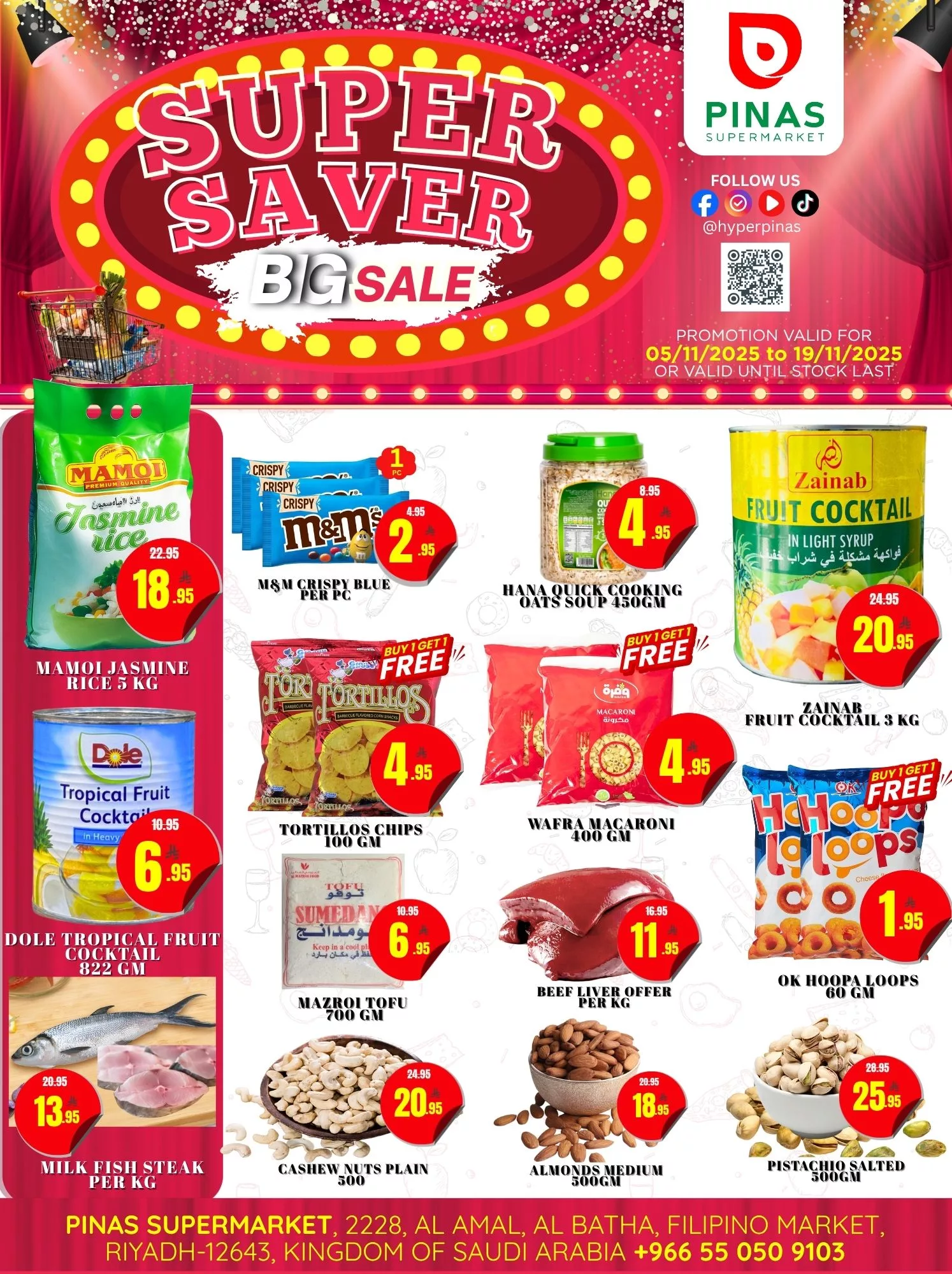 عروض بيناس هايبر ماركت الرياض الأسبوعية الأربعاء 5 نوفمبر 2025 تحتوي على منتجات غذائية تشمل اللحوم الطازجة والدواجن والفواكه والخضروات والعسل الطبيعي والمخبوزات والجبن والألبان والعصائر الطازجة بالإضافة إلى تخفيضات على الأجهزة المنزلية مثل أفران البيتزا وأجهزة الطهي الذكية ومكائن العجن وغيرها باقل الاسعار